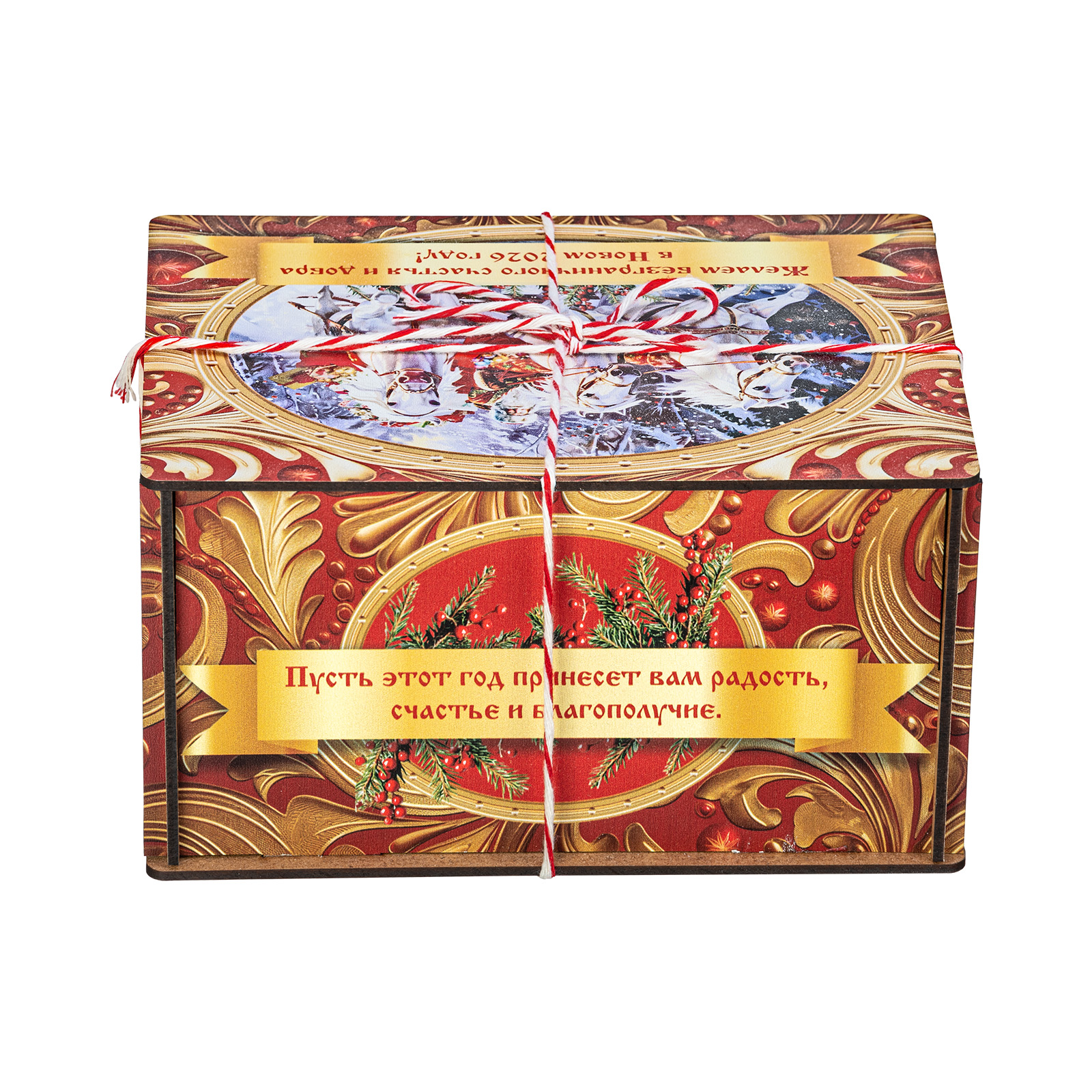 Ищете новогодний сладкий подарок подростку или взрослому? Присмотритесь к набору “Золотые узоры” - это оригинальный конфетный набор в яркой упаковке. В подарок входит килограмм вкусных и разнообразных кондитерских изделий от ведущих фабрик, а также небольшой памятный сувенир в виде символа наступающего 2026 года.  Сладости бережно упакованы в небольшой деревянный ящик, выполненный в сочетании золотого и красного цветов. На крышке есть небольшая иллюстрация с изображение Дедушки Мороза в упряжке белых грациозных лошадей. Упаковка аккуратно перетянута цветной ручкой шнурком, что еще больше добавляет ей привлекательности.